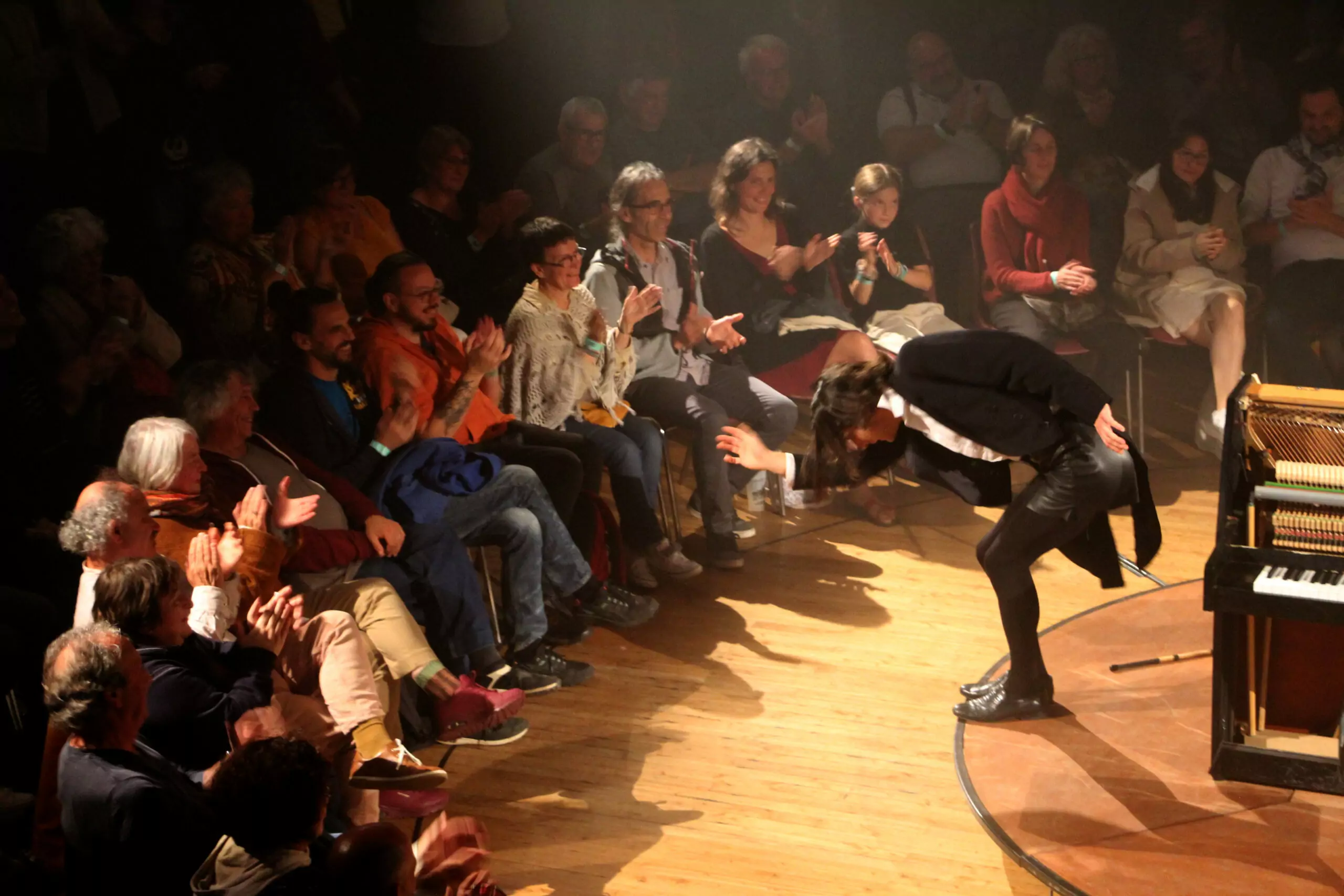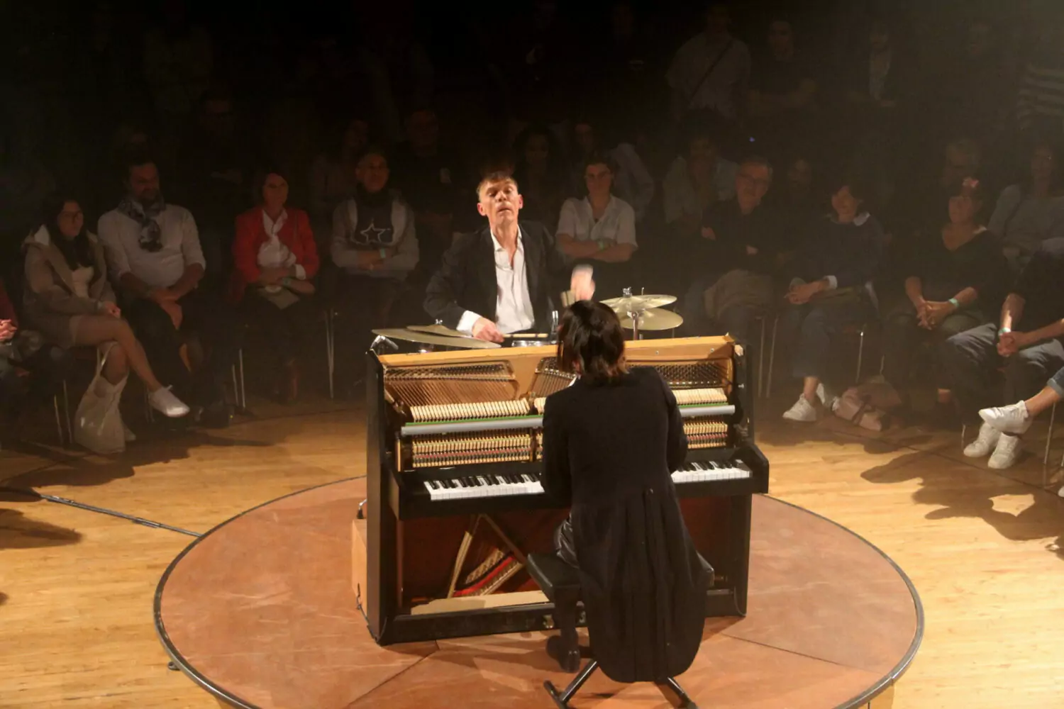 Faut-il céder ? Ou résister ? Dans ce duo burlesque et musical, ces deux personnages loufoques et excentriques évoluent dans un joyeux chaos, entre clownerie et virtuosité. La compagnie i.Si nous invite à une partition décalée, où tout semble tourner, glisser, tanguer. Une expérience sensorielle où les corps, les sons et les regards s’entrelacent, pour faire surgir l’imprévu.
