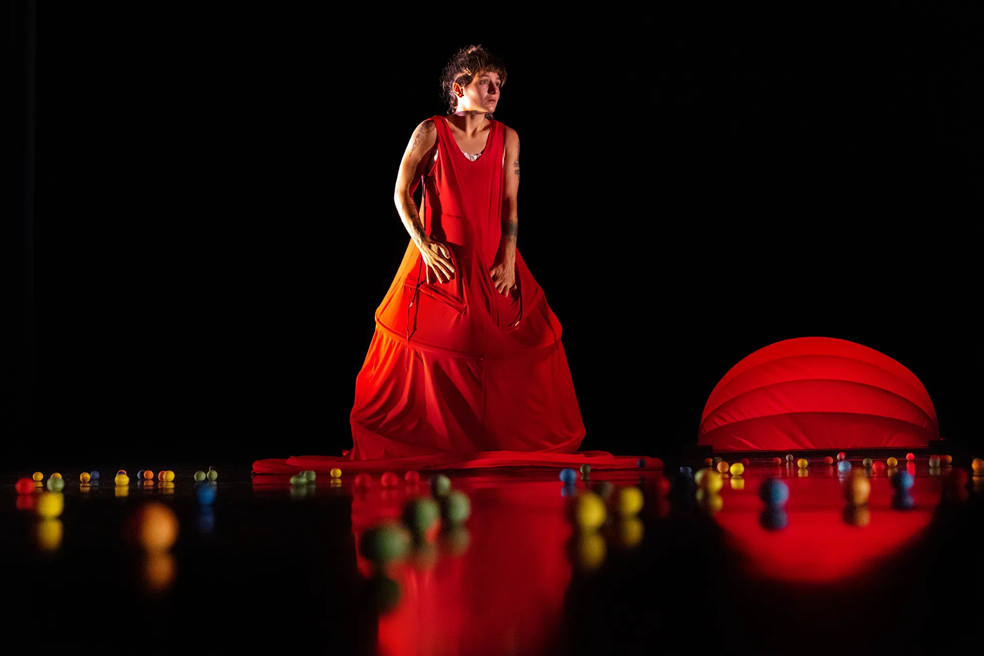 « Le Mensonge » est l’histoire délicate d’une petite fille qui a menti, un soir à table. En entrant dans sa chambre, elle retrouve son mensonge sous la forme d’un rond rouge. Le lendemain à son réveil, ce rond est encore là, insistant, ineffaçable. Le soir au coucher il est toujours là. Au fil des jours, ce rond va gonfler, se multiplier, envahir son espace. Nous suivons le point de vue de cette petite fille, nous plongeons dans son espace mental où un petit grain de sable va devenir une montagne. C’est une immersion dans son monde intérieur, dans son obsession tournoyante pleine de champignons vénéneux, de rêves et d’illusions. De ce mensonge, on ne saura pas un traître mot. Ça se joue au corps à corps entre elle et lui, mais ça pourrait se jouer entre tous les menteurs et tous les mensonges du monde… L’ingéniosité des décors, des costumes, de la danse des trois interprètes, font de ce spectacle délicat et pétillant une merveille à découvrir.